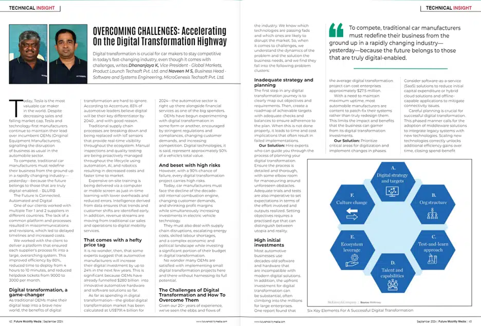 MicroGenesis was prominently featured in Future Mobility Media, where Dhananjay K., Vice President – Global Markets, and Naveen M.S., Business Head – Software and Systems Engineering, shared key insights on the challenges and opportunities in automotive digital transformation.